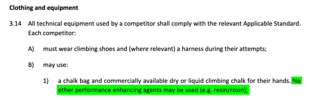 Because of the recent compulsory use of liquid chalks in climbing gyms due to Covid-19 health measures, gyms are now seeing the effects on their holds from rosin containing liquid chalk. Some have described it in extreme circumstances as looking like “peeling paint” when they clean the holds – a layer of thin tacky gum that is hard to remove. According to page 22 of their rulebook The International Federation of Sport Climbing actually prohibits rosin in all climbing competitions.