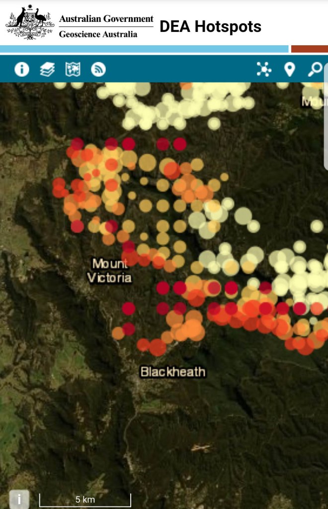 Using data from satellites, this website shows areas of heat (i.e. fires) on a map. It is usually updated every couple of hours so it can give an accurate idea of the location of fires that may not be officially recorded yet. It can also be a useful app to crosscheck the Hazards Near Me app.